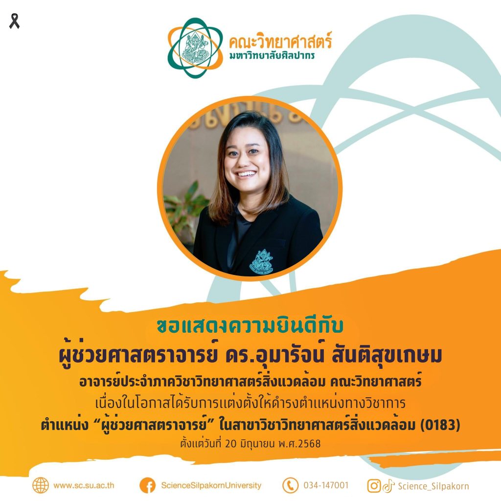 กับ ผู้ช่วยศาสตราจารย์ ดร.อุมารัจน์ สันติสุขเกษมอาจารย์ประจำภาควิชาวิทยาศาสตร์สิ่งแวดล้อม คณะวิทยาศาสตร์ มหาวิทยาลัยศิลปากร เนื่องในโอกาสได้รับการแต่งตั้งให้ดำรงตำแหน่งทางวิชาการ ตำแหน่ง “ผู้ช่วยศาสตราจารย์” ในสาขาวิชาวิทยาศาสตร์สิ่งแวดล้อม (0183)